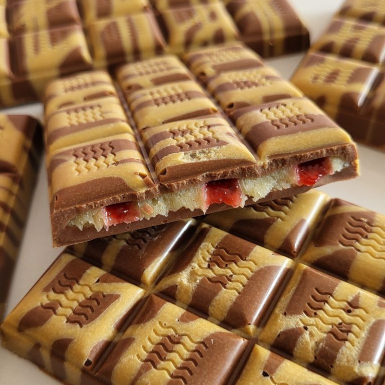 Chocolate con leche, crema de cacahuete y gel de frambuesa decorado con chocolate gold
