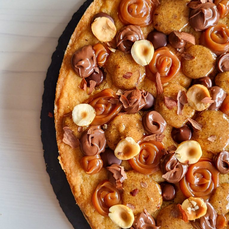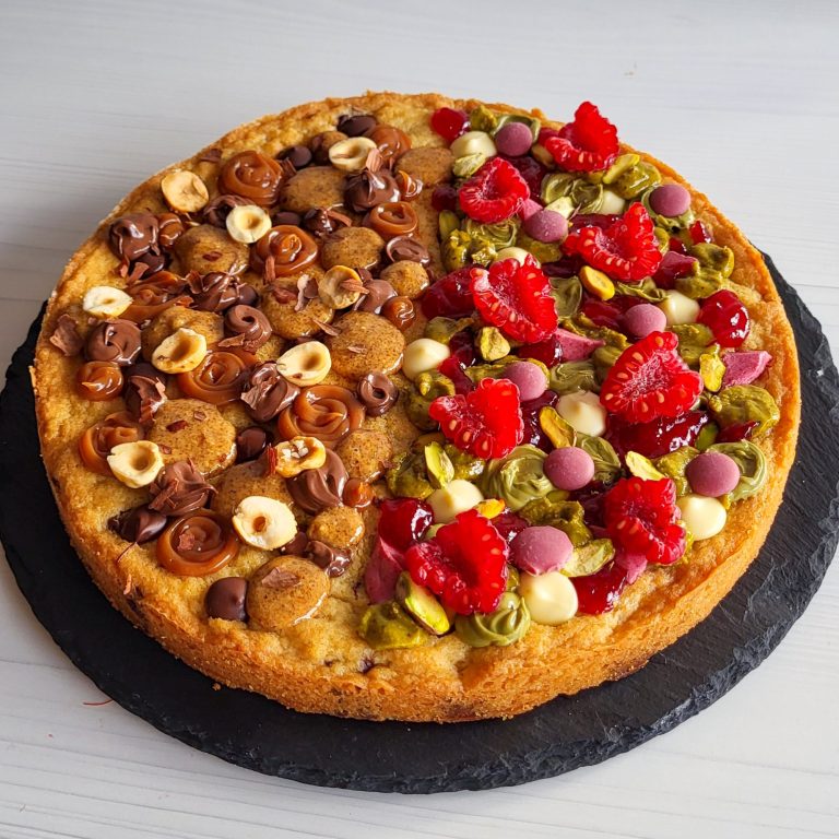 Mi deliciosa masa de cookie en formato tarta, crujiente por fuera, blandita por dentro y con muchos toppings.