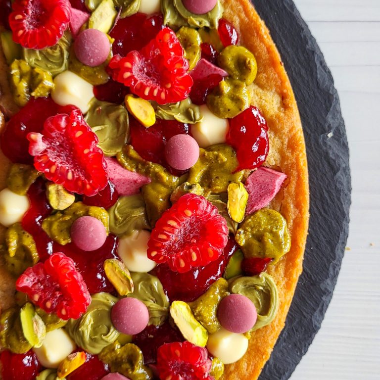 masa de cookie, chips de chocolate blanco, confit de frambuesas, crema de pistacho, frambuesas frescas