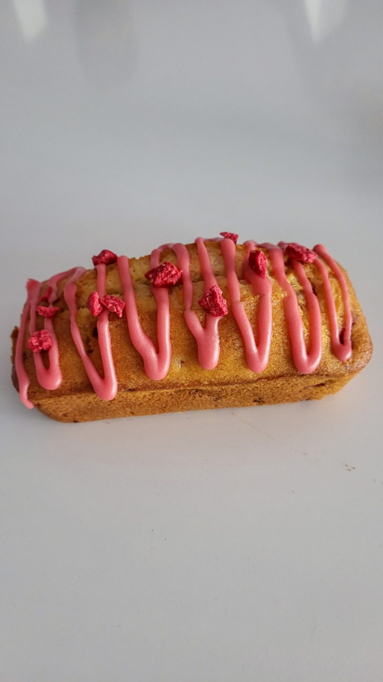 - Cake de yogur y frambuesa, con glaseado de frambuesa y frambuesa crispy.