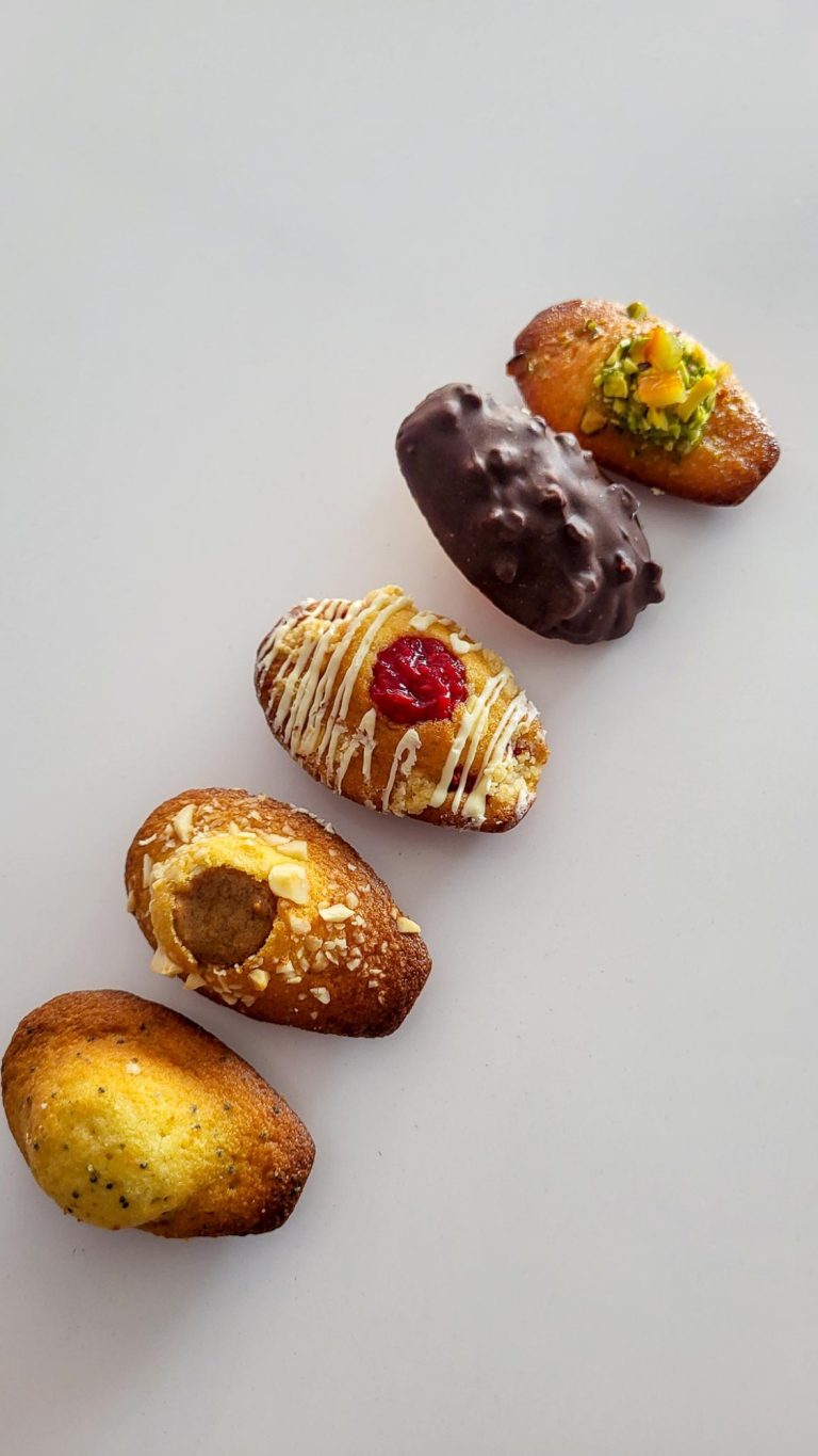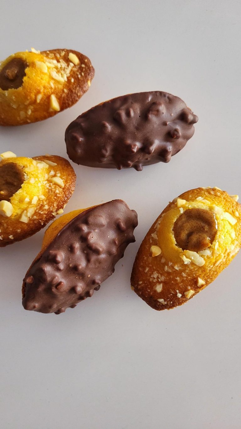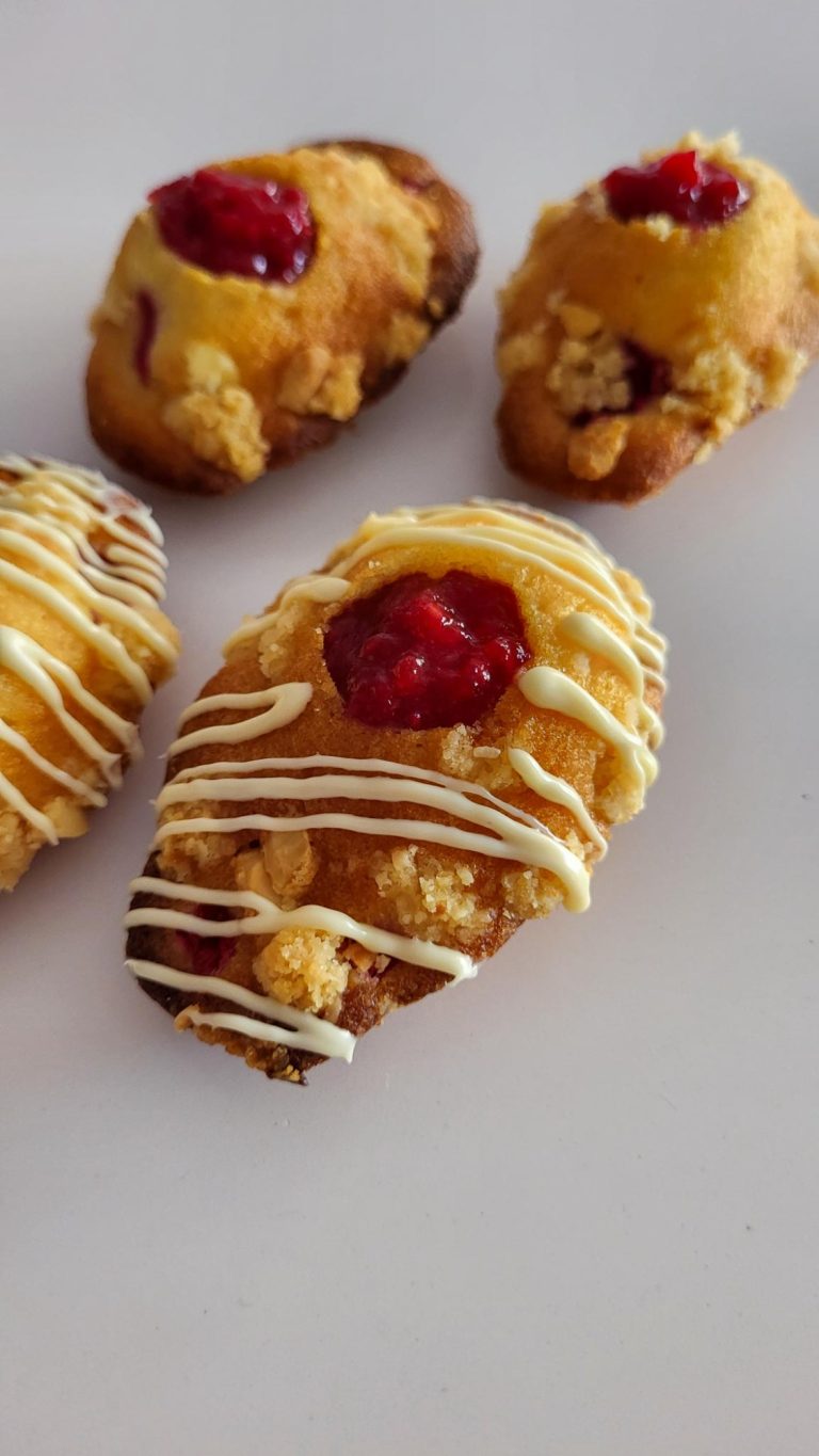 - Madeleine rellena de frambuesa, crumble y chocolate blanco.