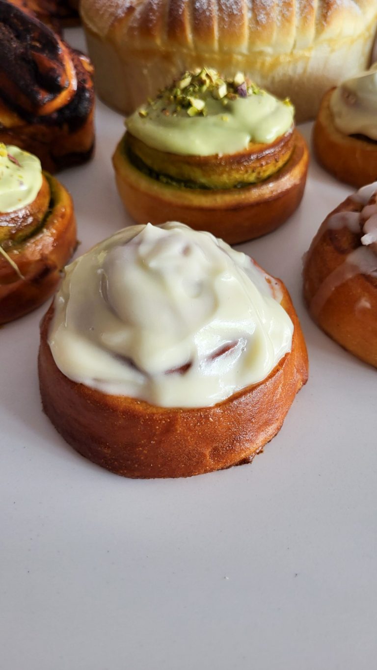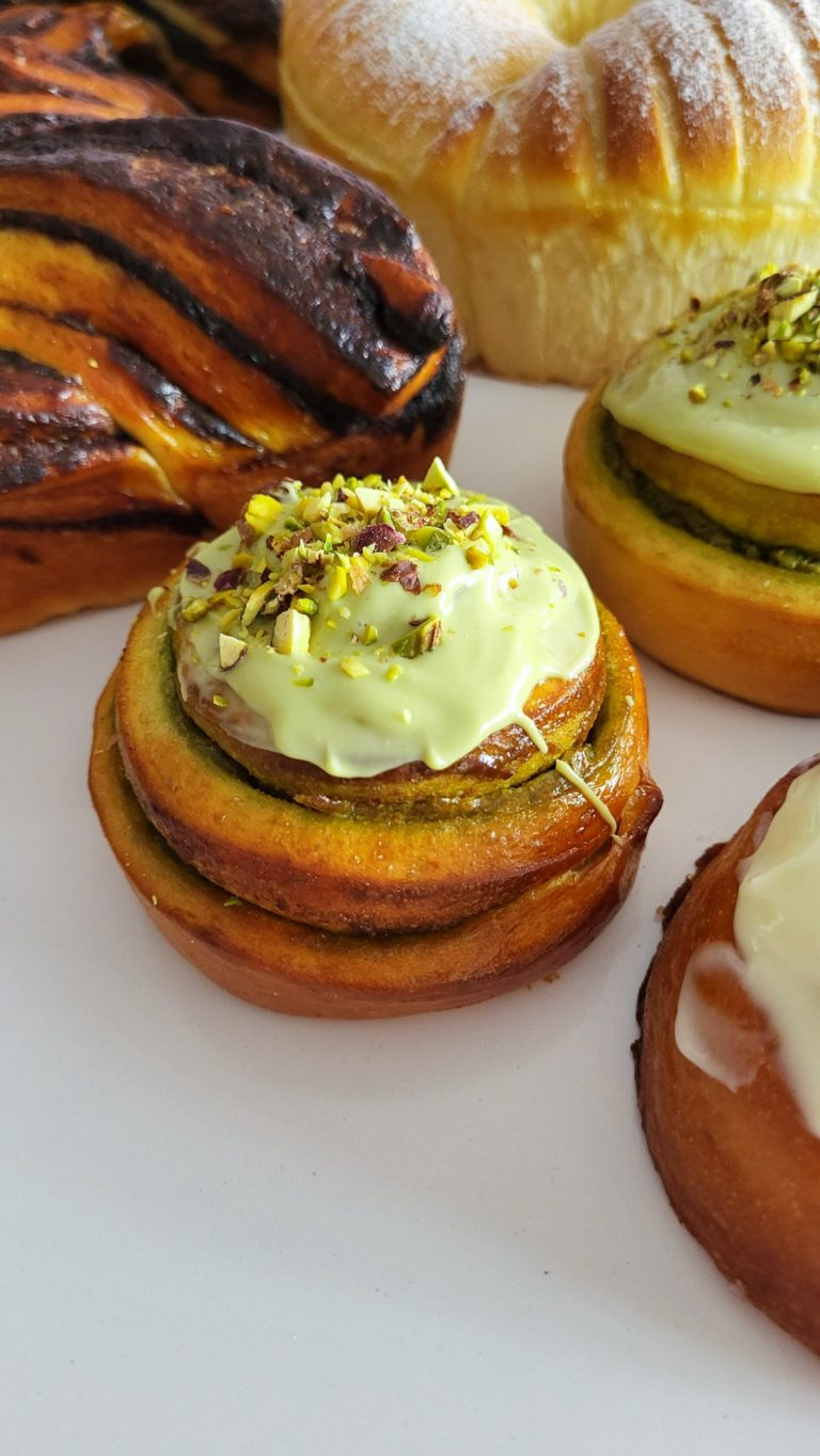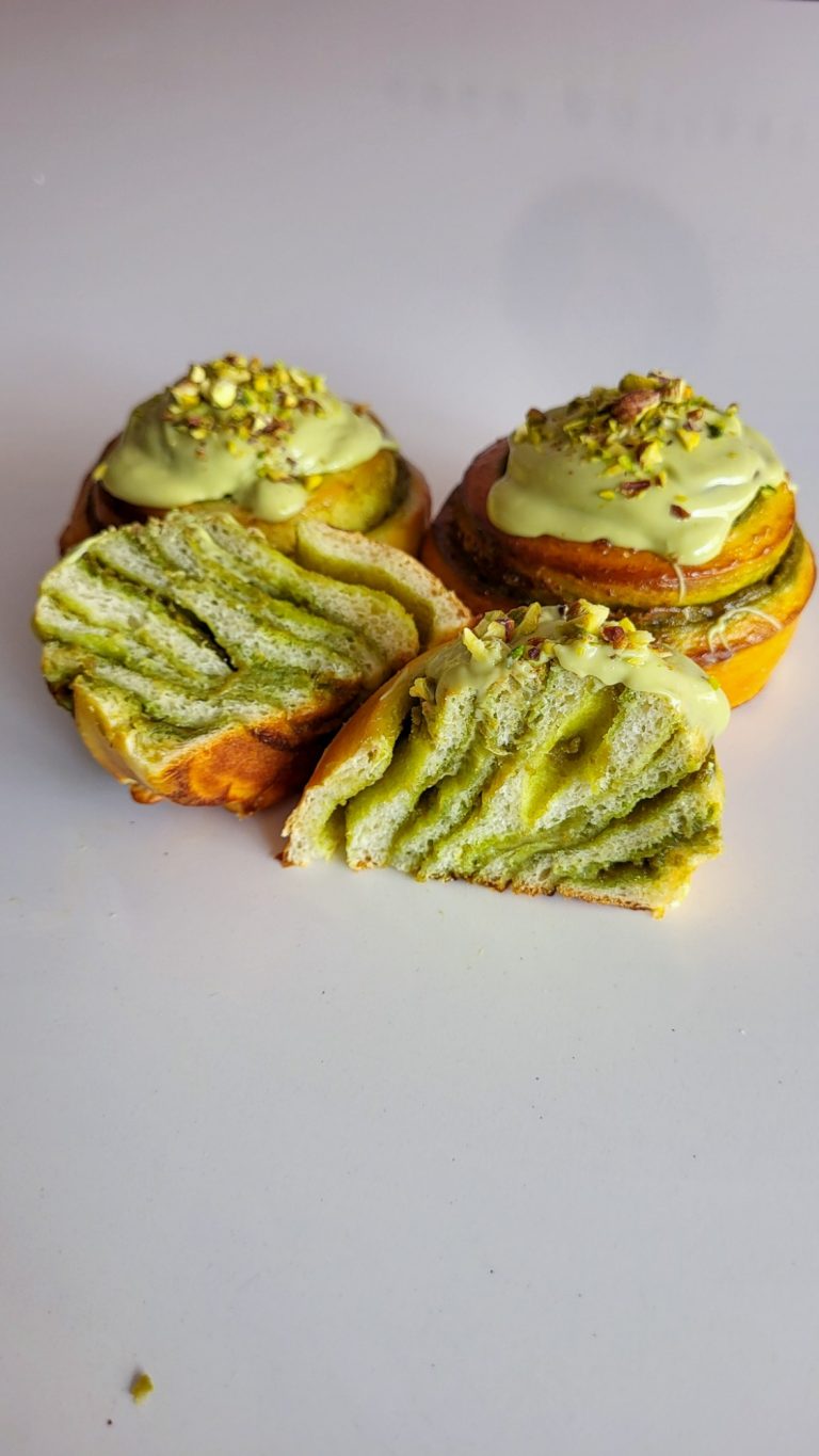 - Rolls de pistacho con glaseado de pistacho y chocolate blanco.