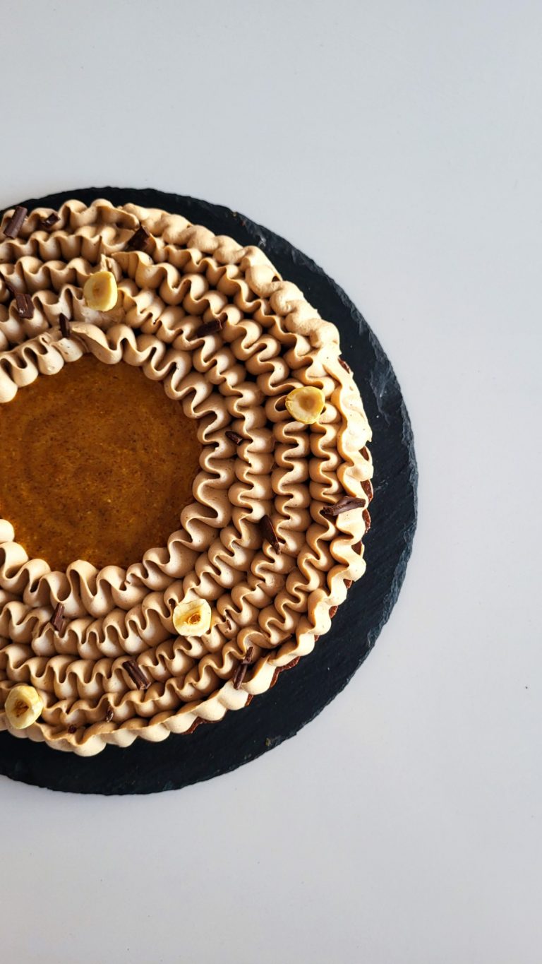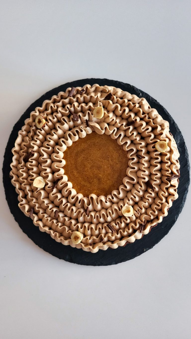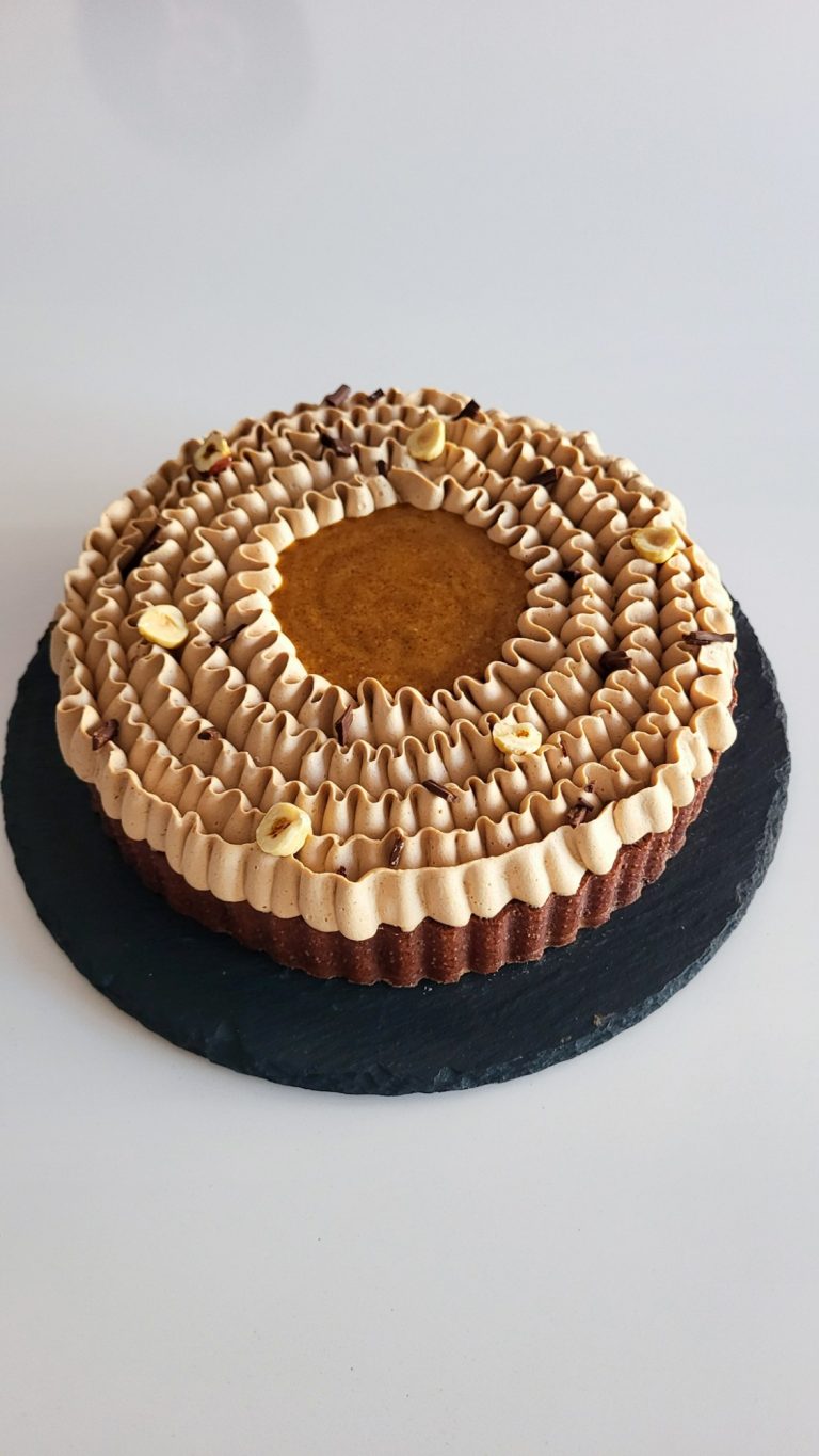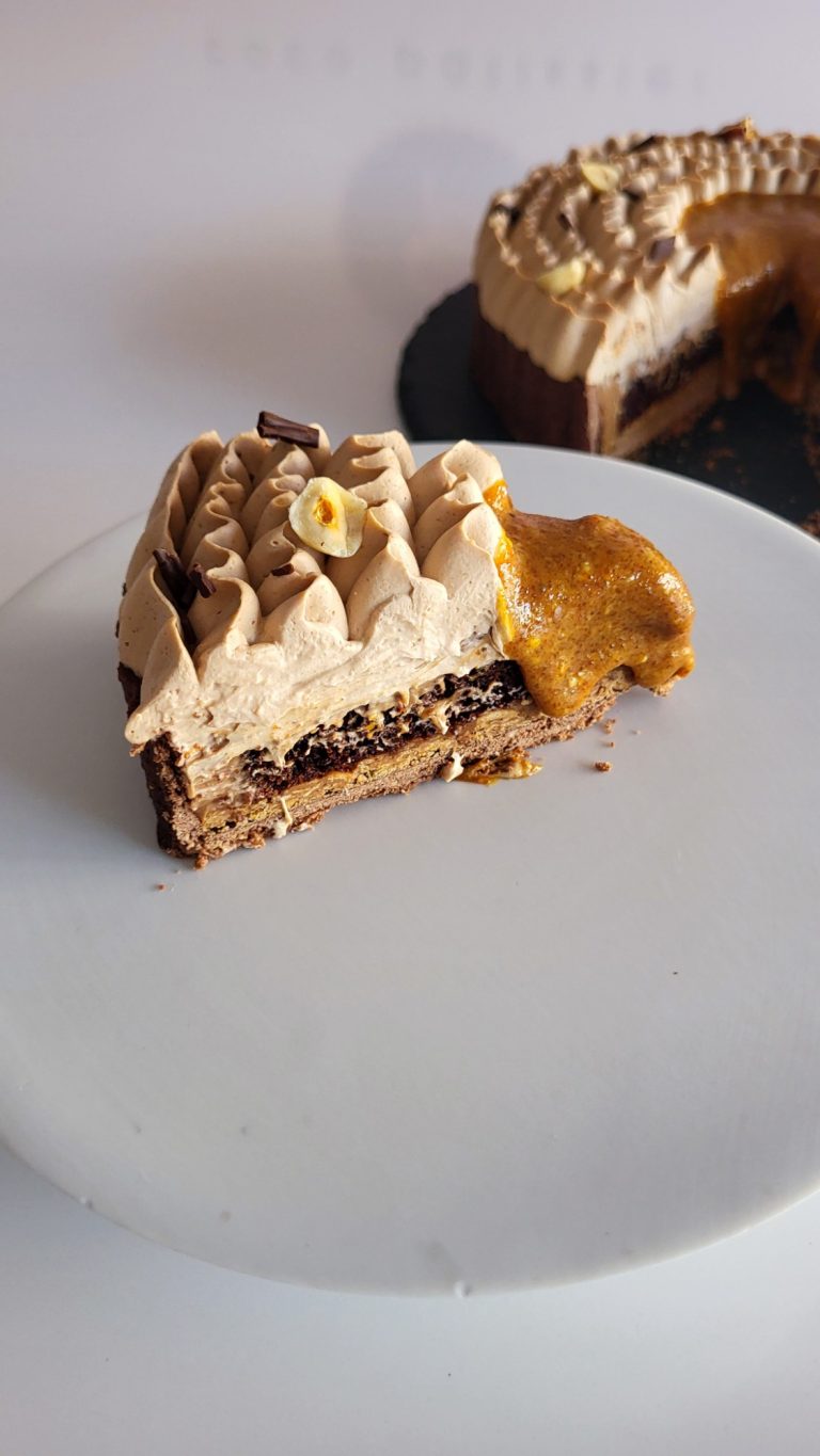 Compuesta por una base sucrée con cacao, crujiente de avellana, bizcocho tierno de cacao, cremoso de chocolate y avellana y ganache montada de chocolate y avellana.