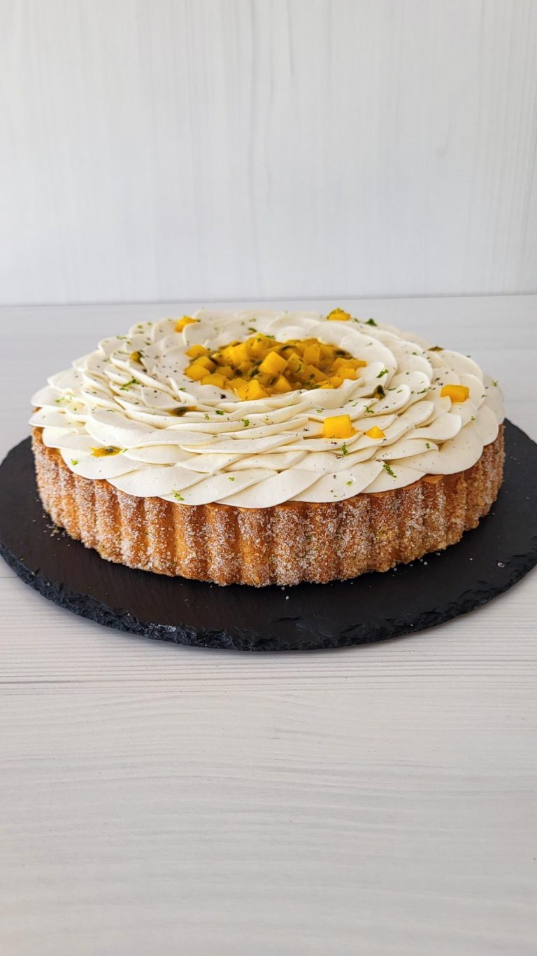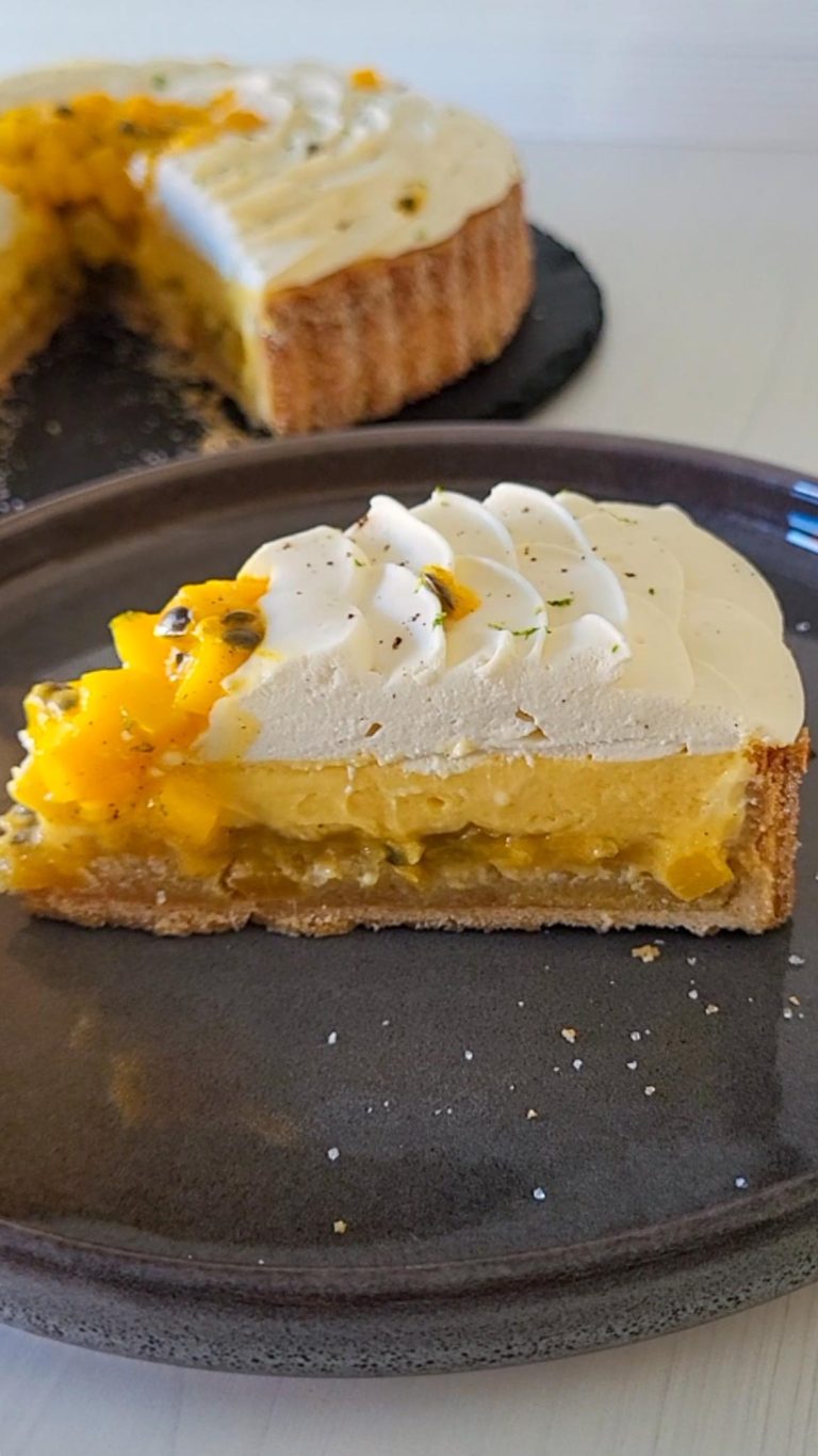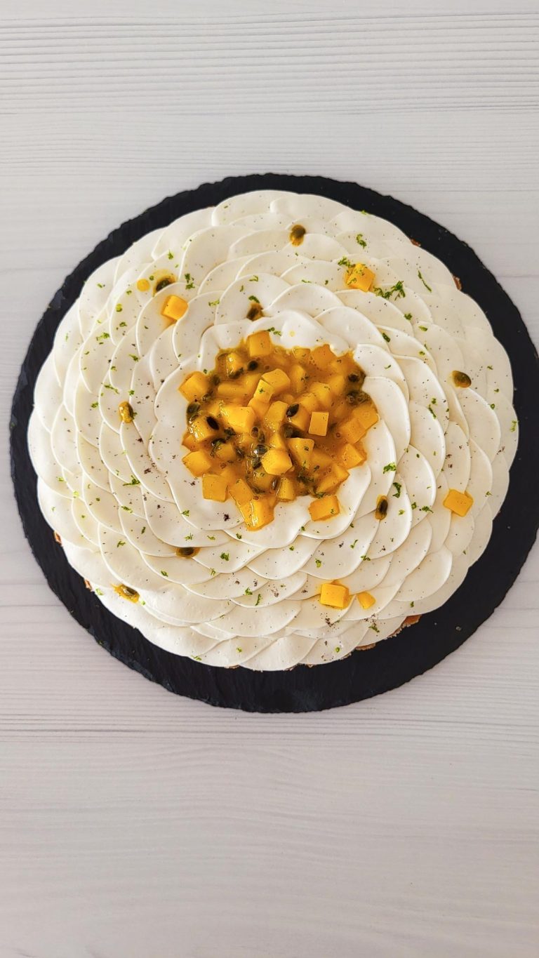 Compuesta por una base sucrée, bizcocho de almendra, confit de mango, maracuyá y lima, cremoso de maracuyá y ganache ligera de vainilla.
